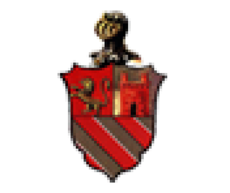 ”““Di rosso, al leone rampante d’oro, sinistrato da un castello d’argento torricellato di due pezzi, aperto e finestrato del campo; la campagna palata di rosso e di azzurro, i pali del secondo bordati d’argento, l’ultimo con la bordura solo a destra; la bordura dello scudo composta alternativamente d’argento, d’azzurro, d’argento e di rosso.”